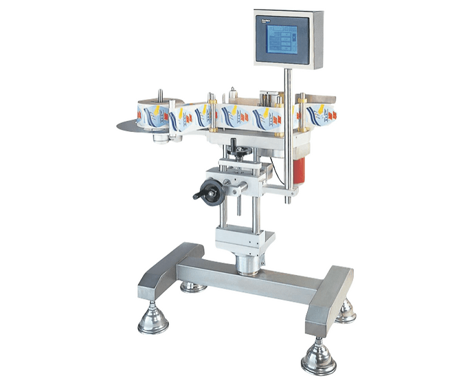 Top label applicator with stand for those customers who already have an existing conveyor line • An efficient, easy-to-use system for labeling the tops of products